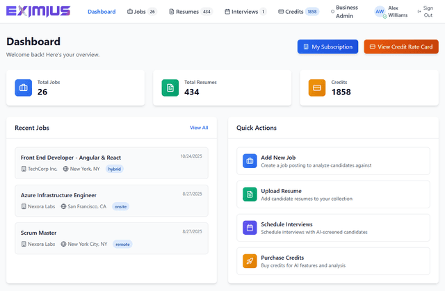 - Eximius for Businesses empowers staffing firms and enterprise hiring teams to streamline collaboration, manage high-volume recruitment, and drive faster, data-backed hiring decisions with AI-powered precision.